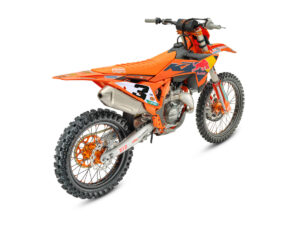 Weitere Verbesserungen der KTM SX-F FACTORY EDITIONs zeigen sich in Alltagstauglichkeit und Robustheit selbst unter härtesten Streckenbedingungen: Dank eines neuen Kühlerverschlusses (der zudem den Zugang erleichtert) und einer frisch gestalteten Schutzkappe für das Quick-Lock-Kraftstoffsystem. Durch präzise Konstruktion von Luftbox, Luftfilter und Einspritzung – in enger Zusammenarbeit mit Partner Akrapovič – erreicht der überarbeitete Titan-Endschalldämpfer die FIM-konformen 109 Dezibel, ohne dass charakteristisches KTM SX-F Drehmoment und Leistung verloren gehen.