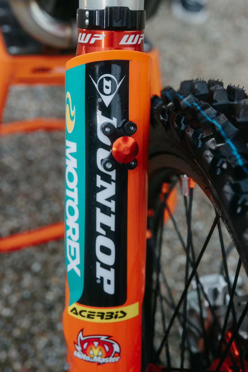 - Werks-Radsatz (schwarze DID DirtStar Felgen, schwarze Speichen, orange Naben und Nippel)